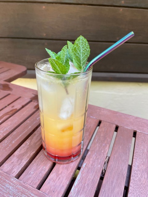 Fill a Collins (tall) glass with ice. Add orange juice, pour in the grenadine and then top with soda. Garnish with fresh mint. Don’t stir, but serve with a reusable or paper straw.